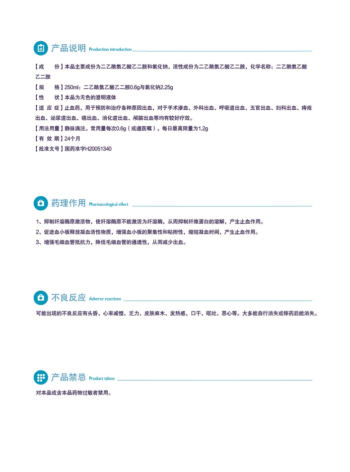 【適 應 癥】止血藥,用于預防和治療各種原因出血,對于手術滲血、外科出血、呼吸道出血、五官出血、婦科出血、痔瘡出血、泌尿道出血、癌出血、消化道出血、顱腦出血等均有較好療效。