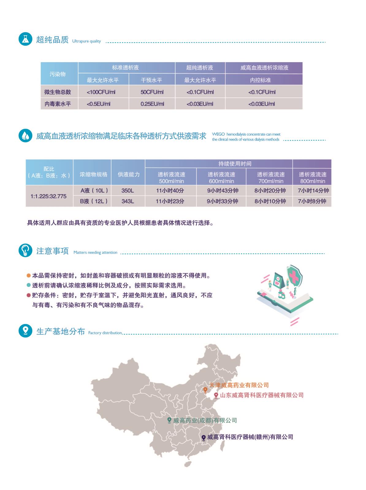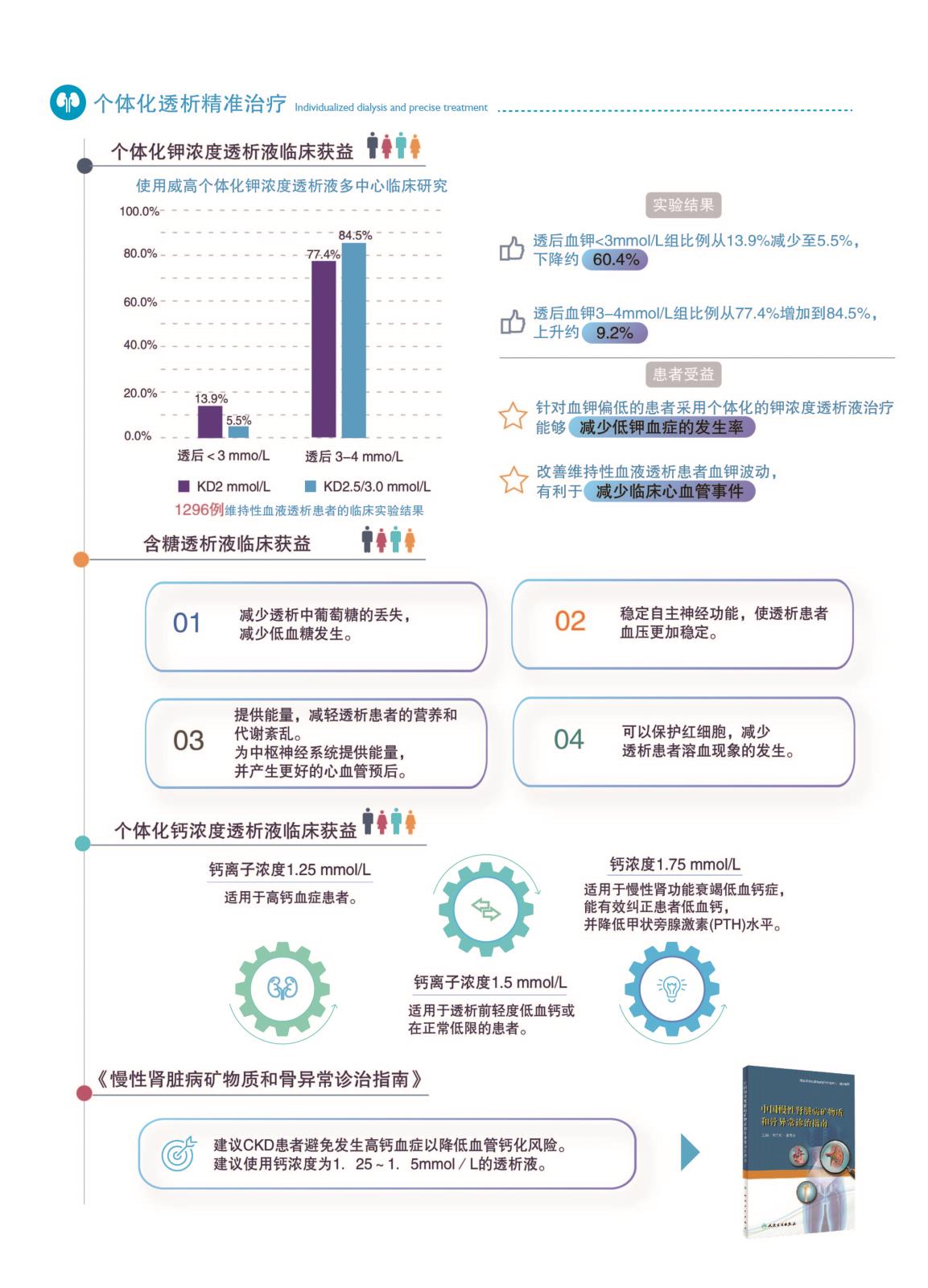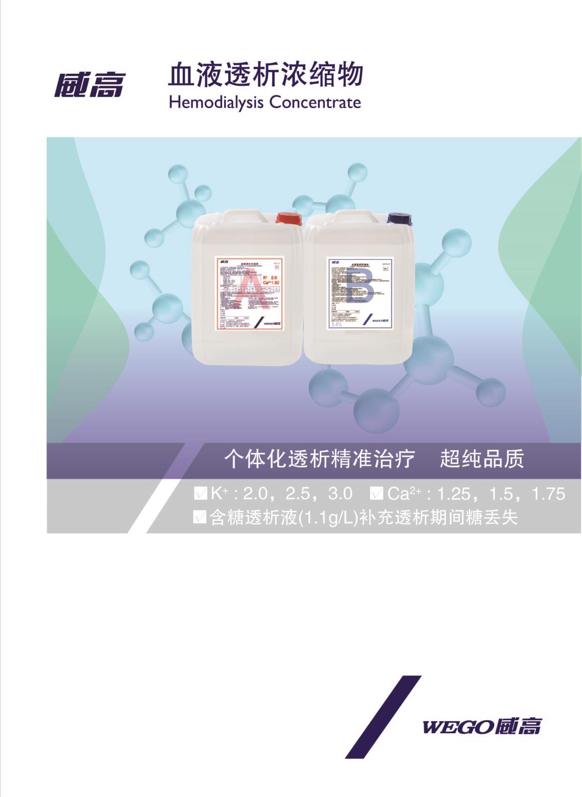 3.提供不同離子配方的血液透析濃縮液(Ca2+:1.25、1.5、1.75;K+:2.0、2.5、3.0;含糖透析液)滿足患者個體化精準透析治療需求。